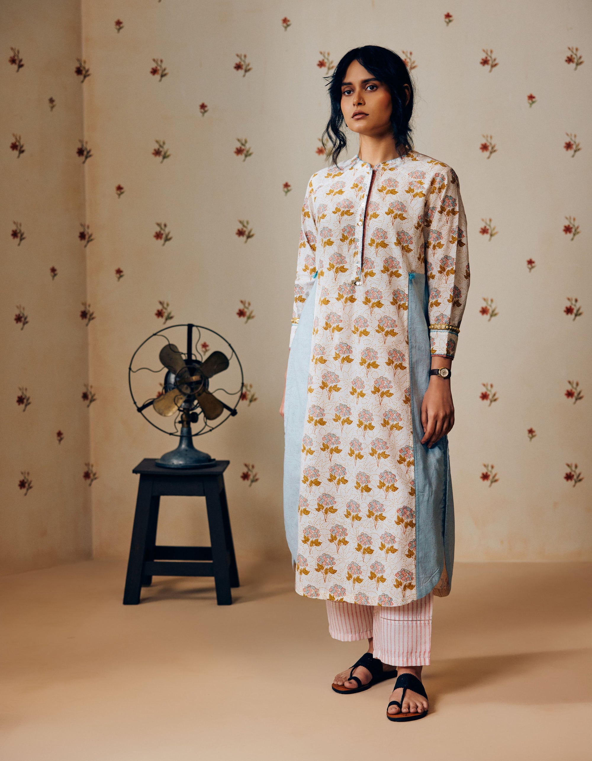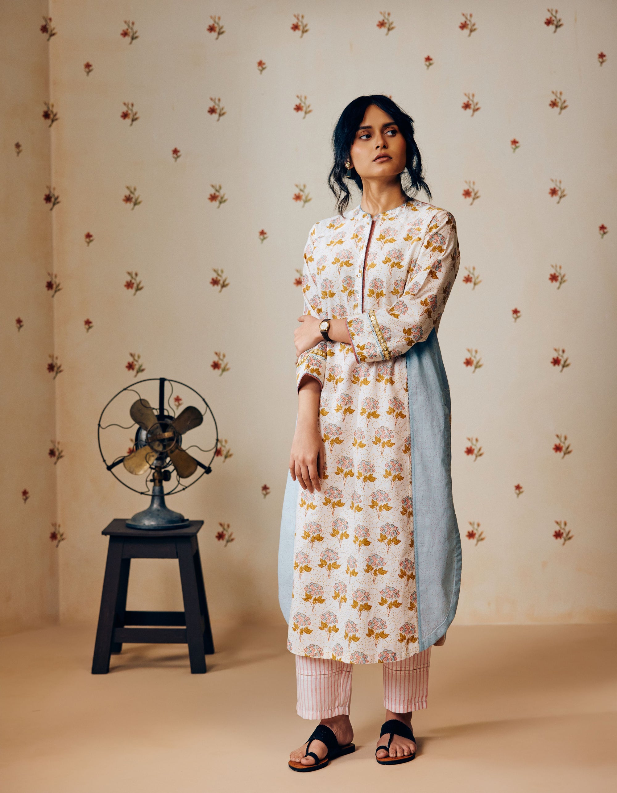 Off White And Powder Blue Mandarin Collar Floral Hand Block Printed Mia Kurta Set
