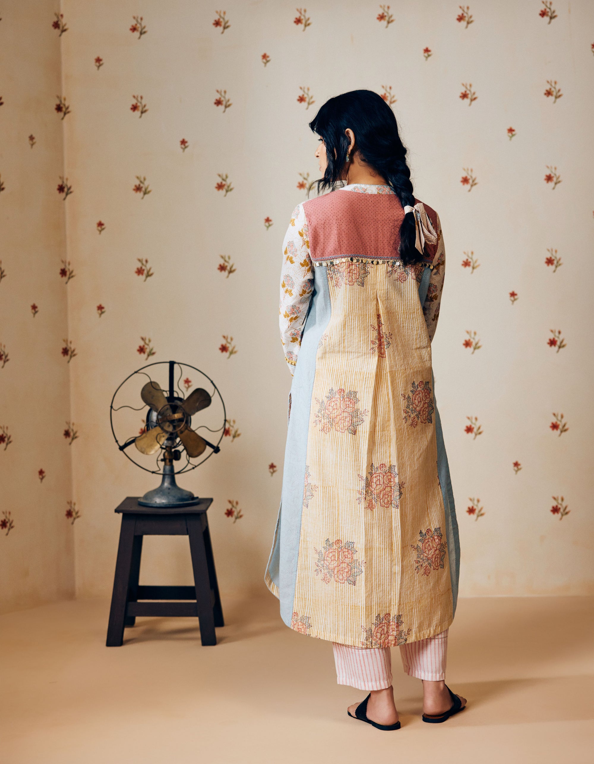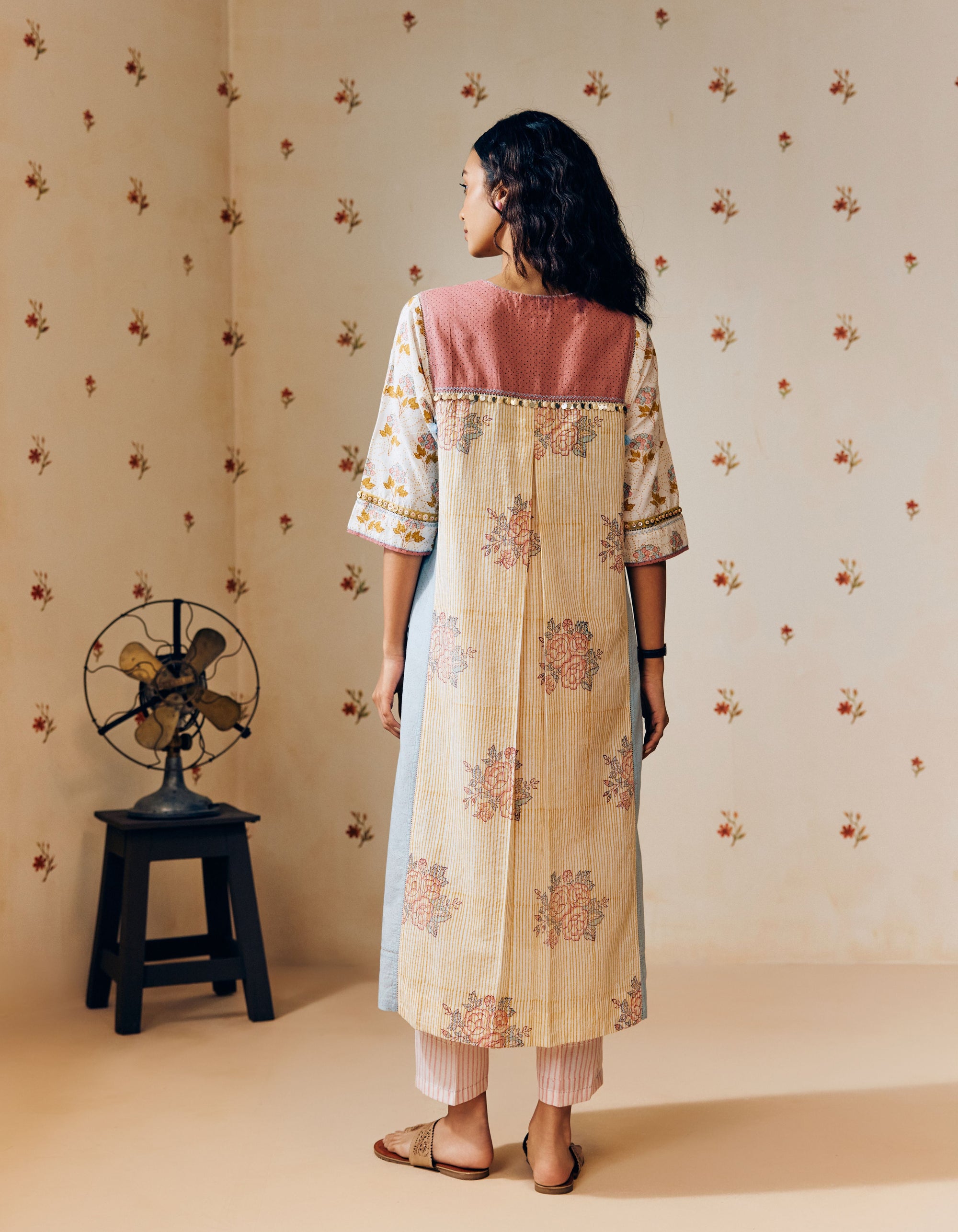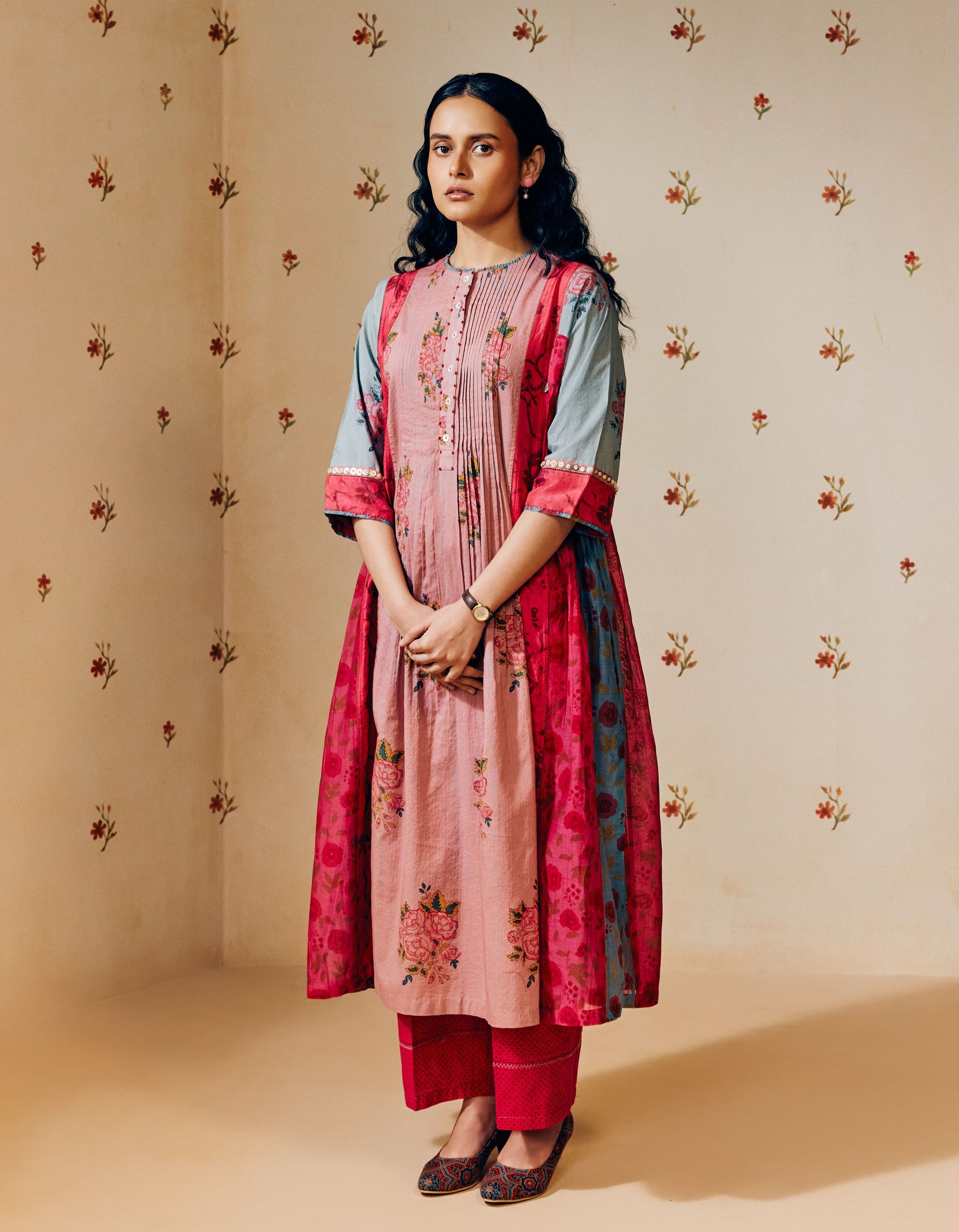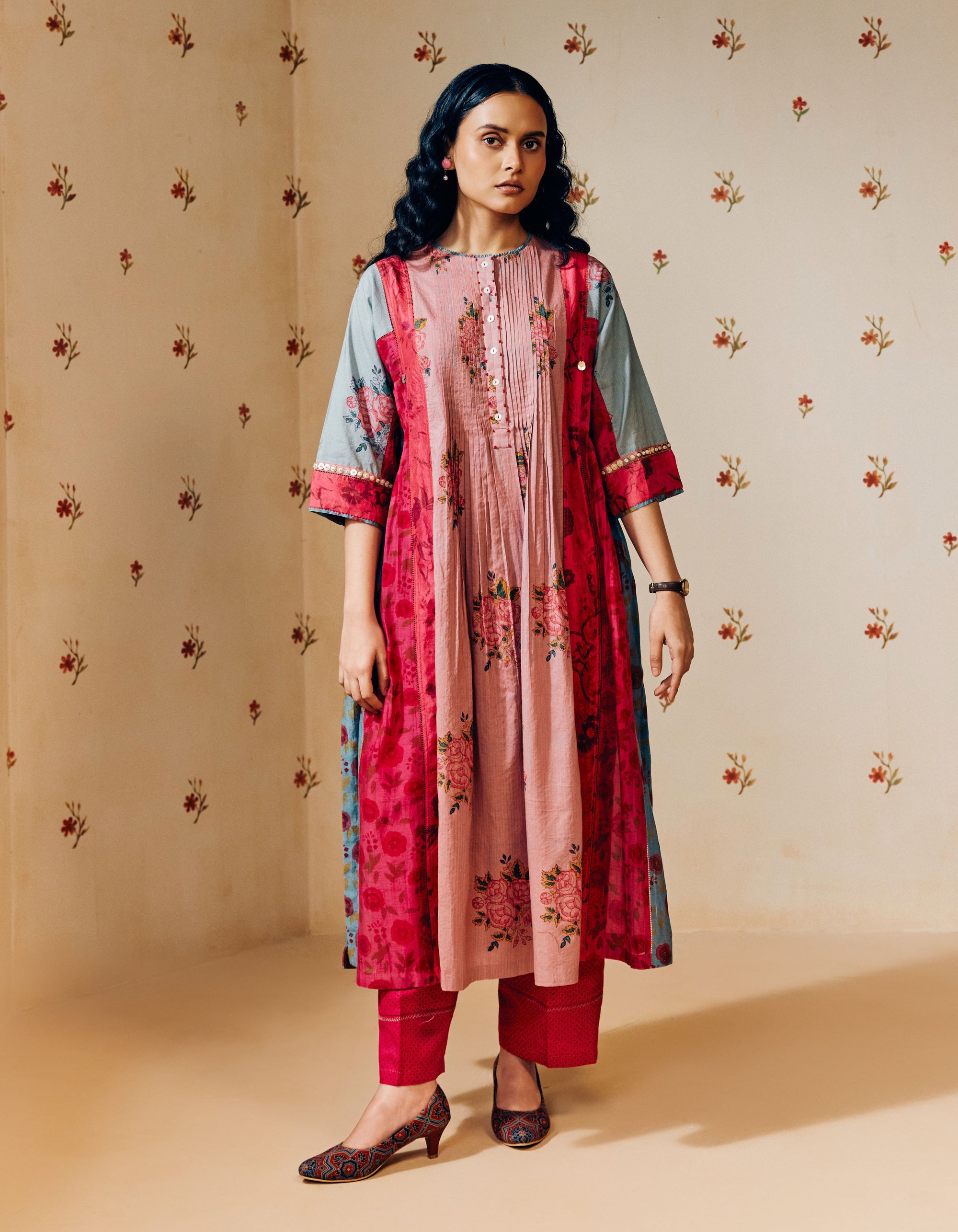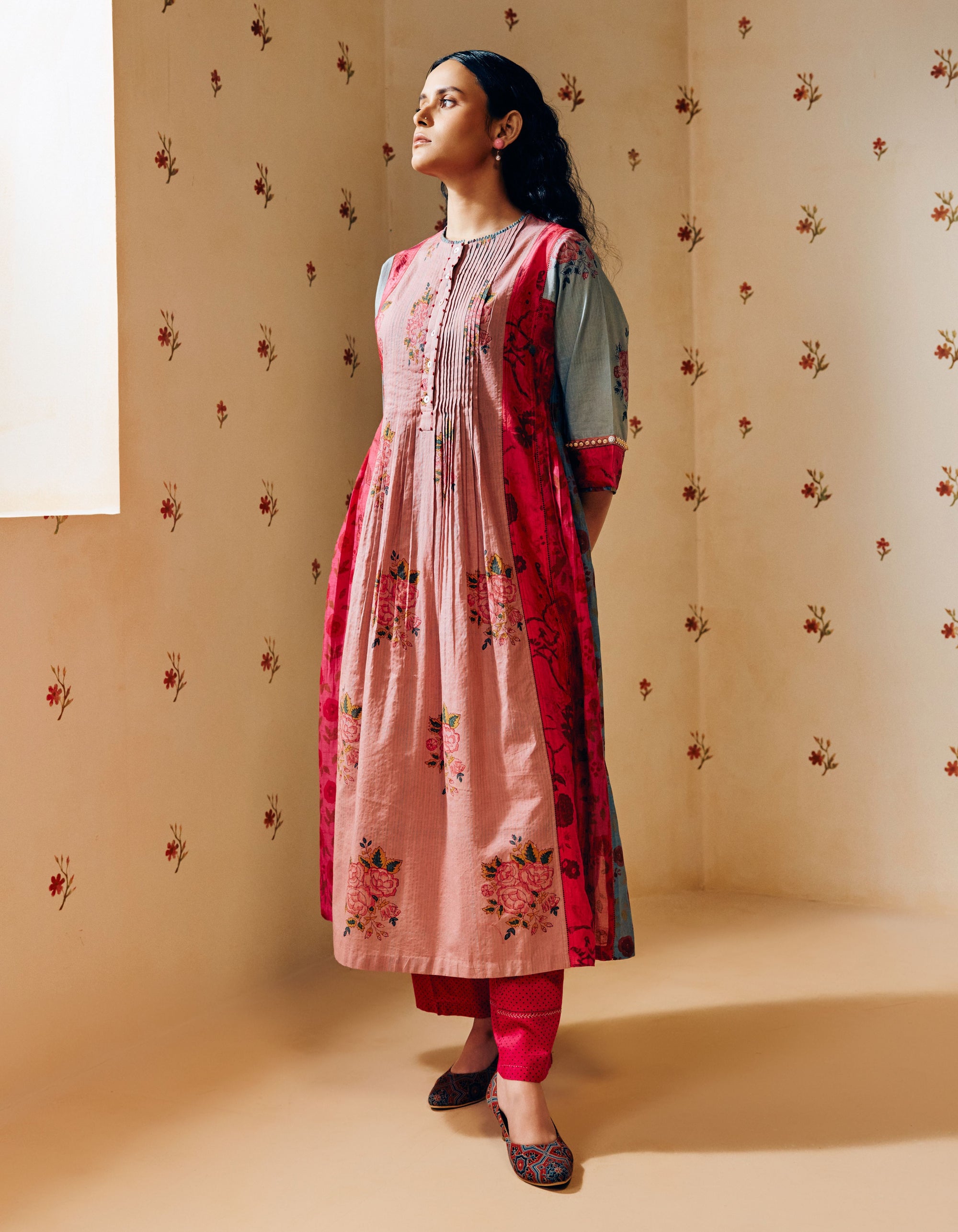 Multi Colour Pink Front Button Placket Floral Hand Block Printed Multi Panel Mia Kurta Set