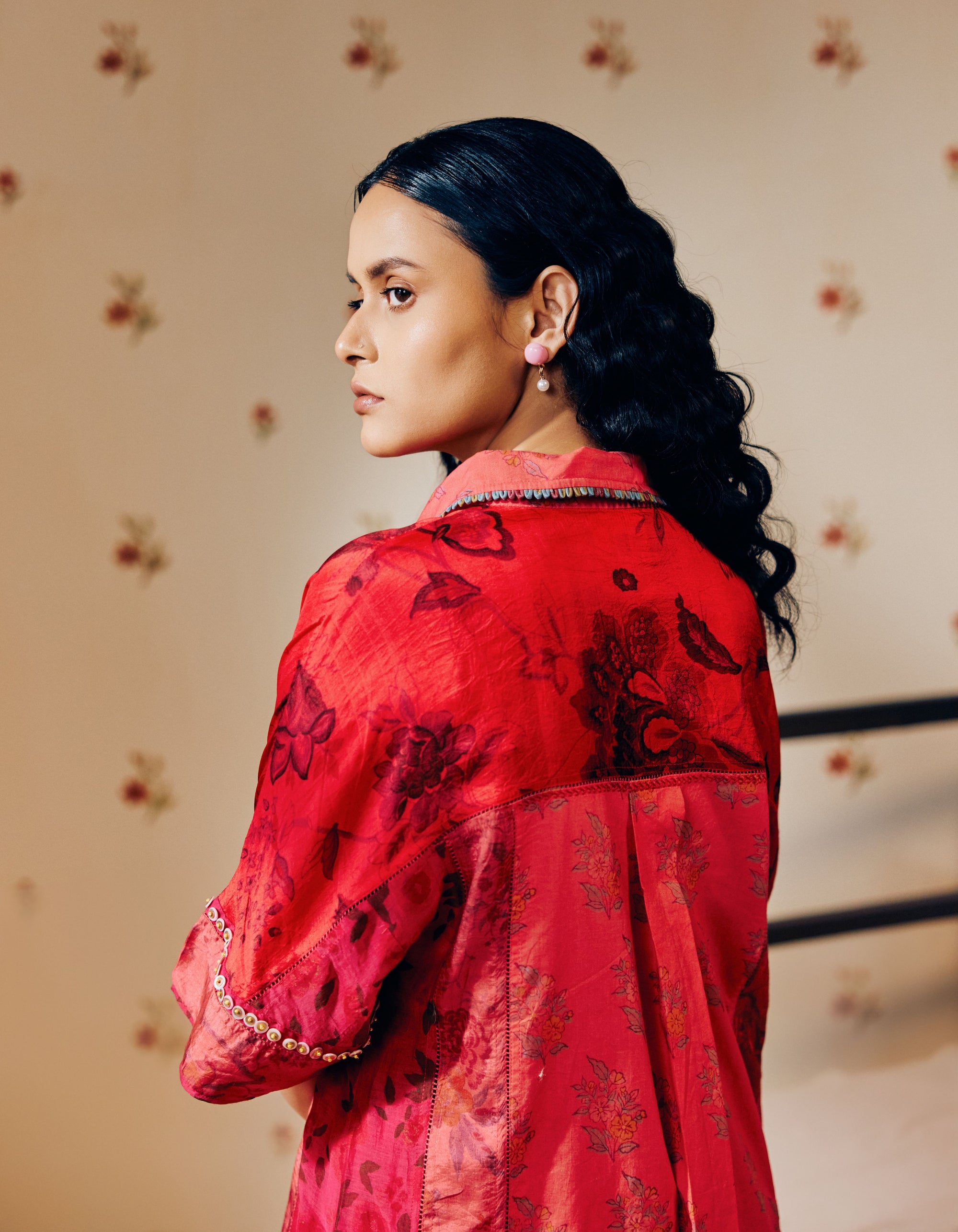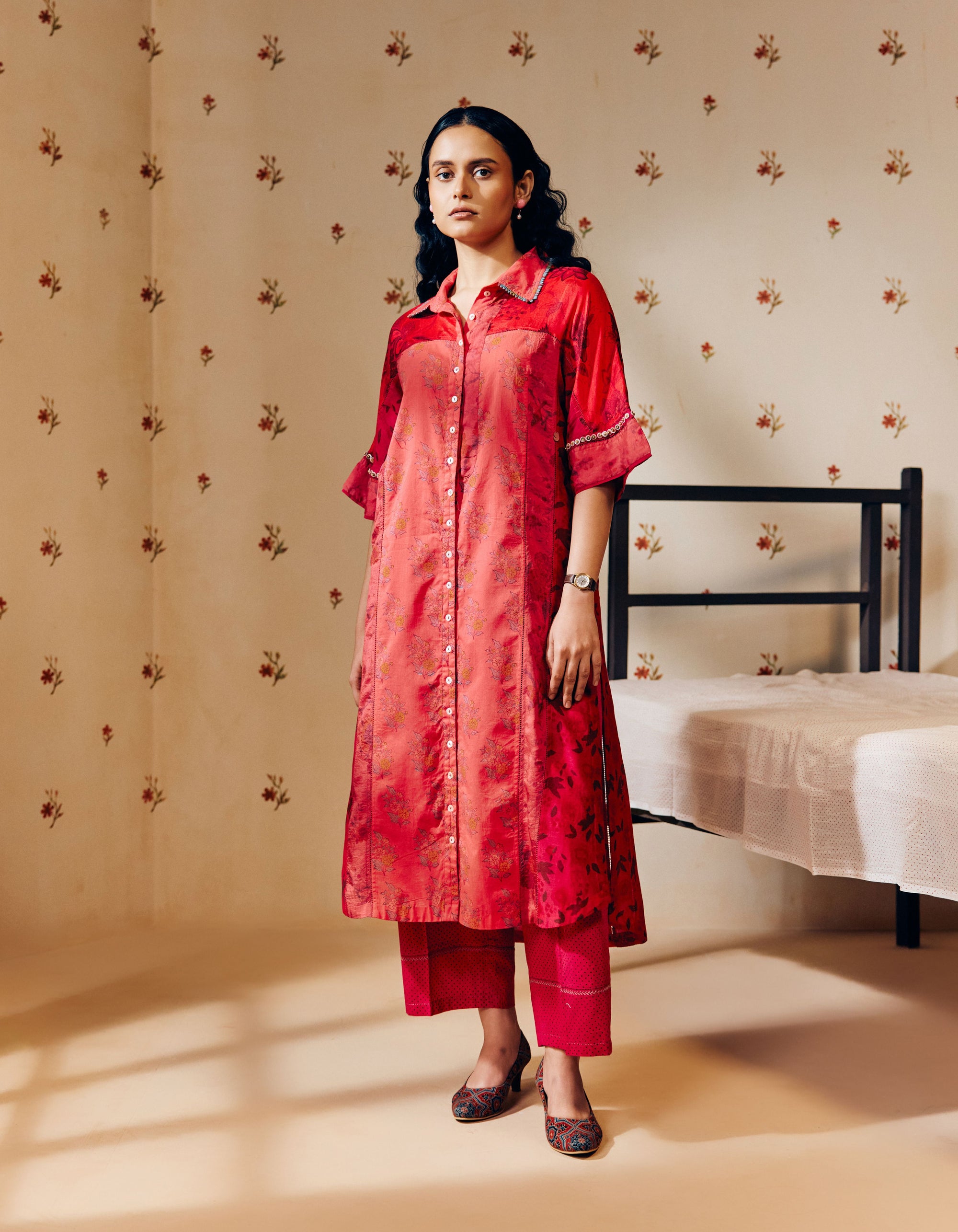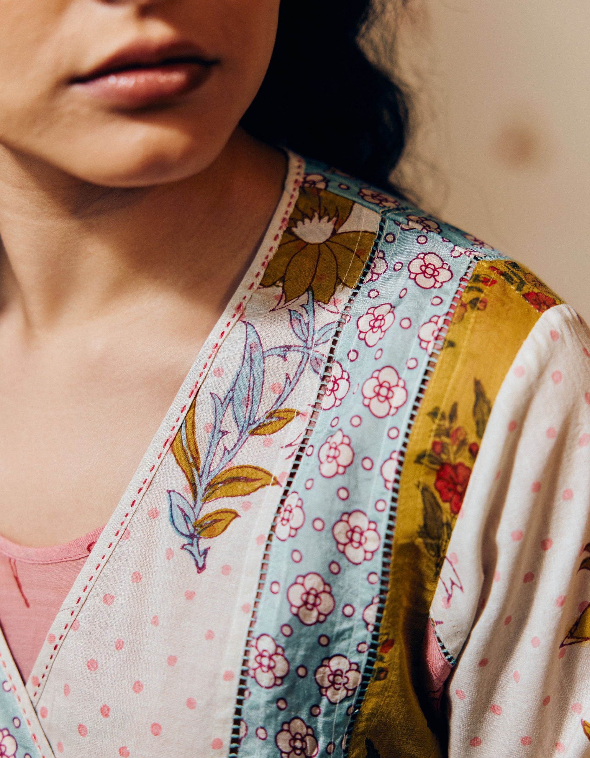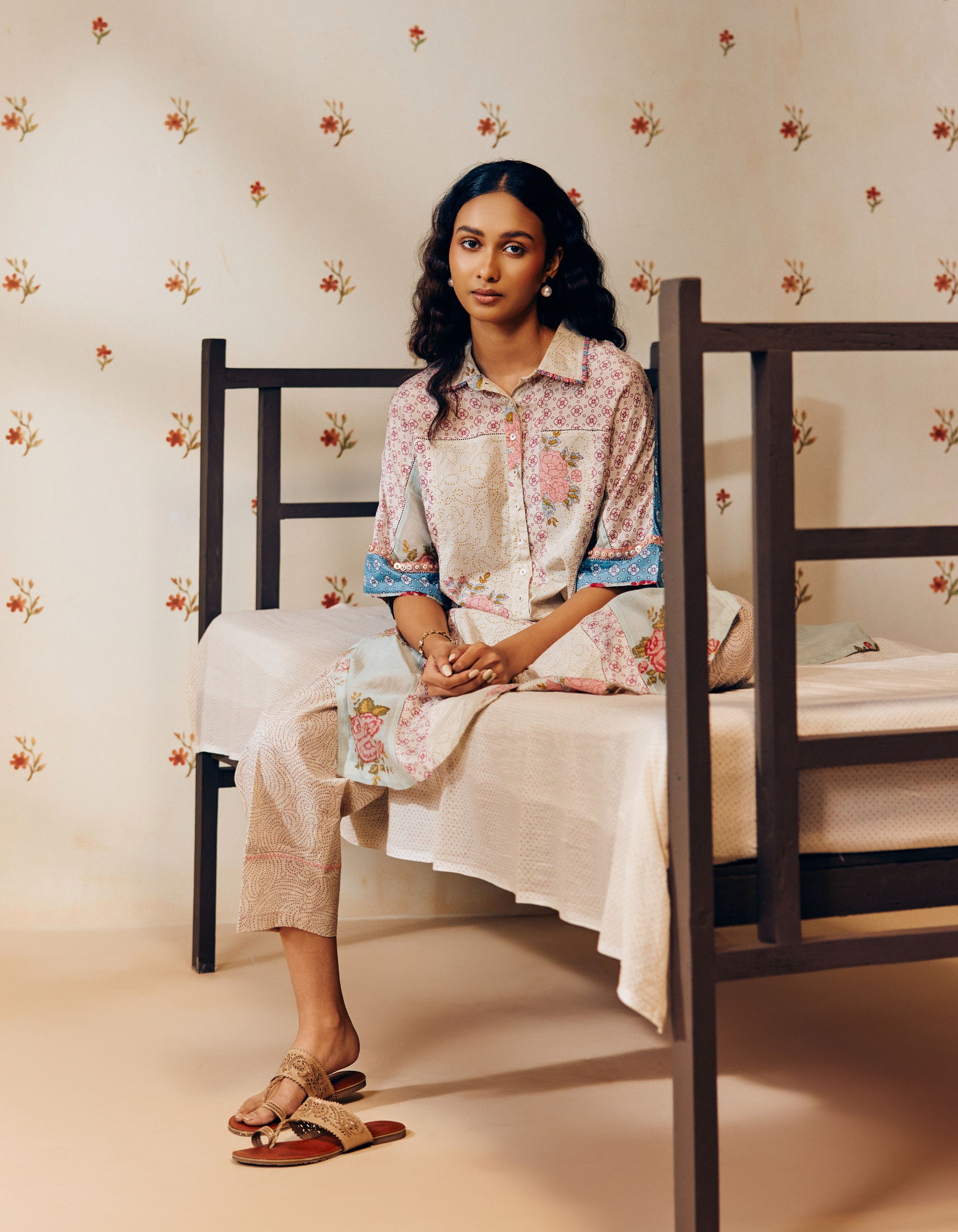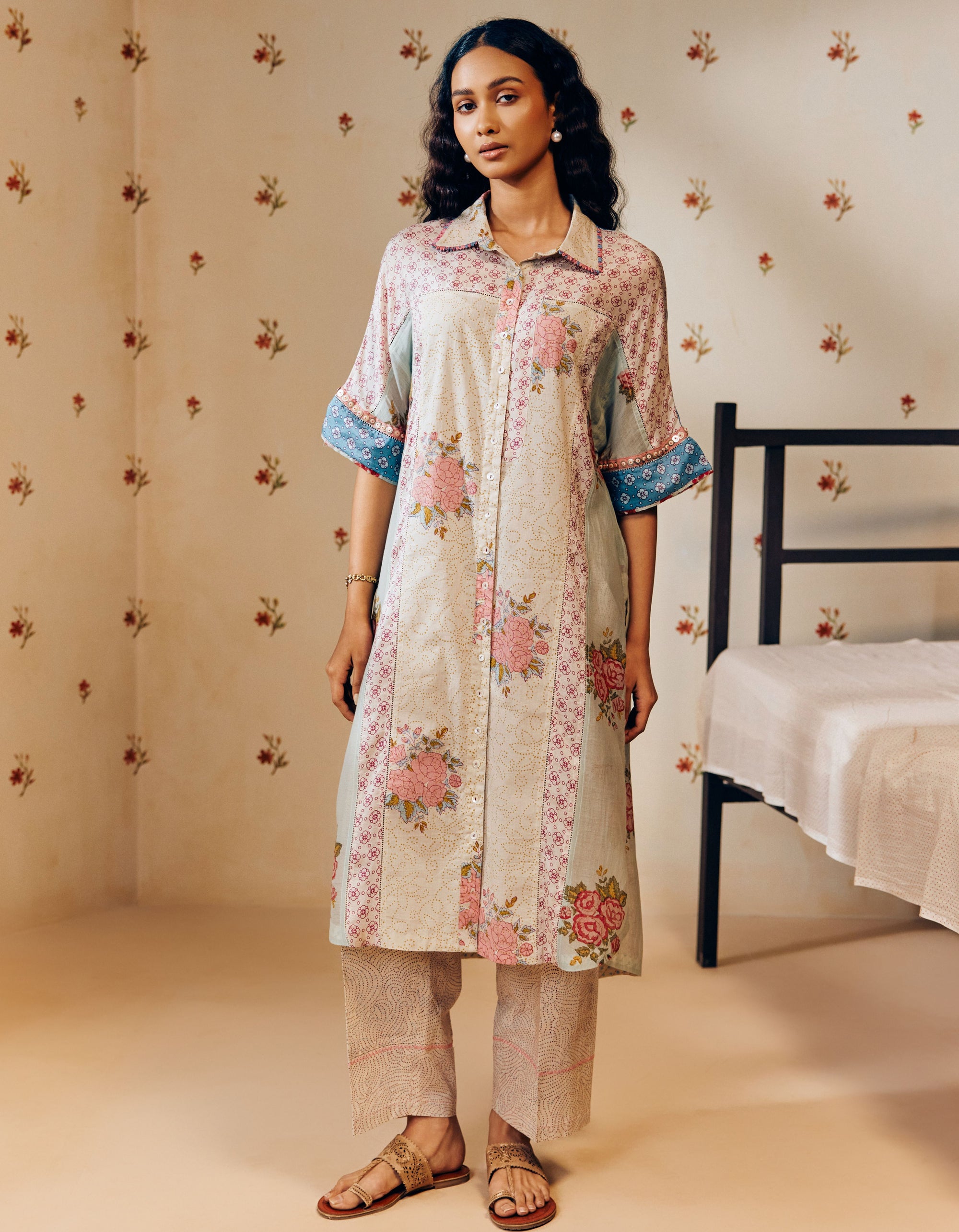 Multi Colour Pink Front Button Placket Floral Hand Block Printed Multi Panel Mia Kurta Set