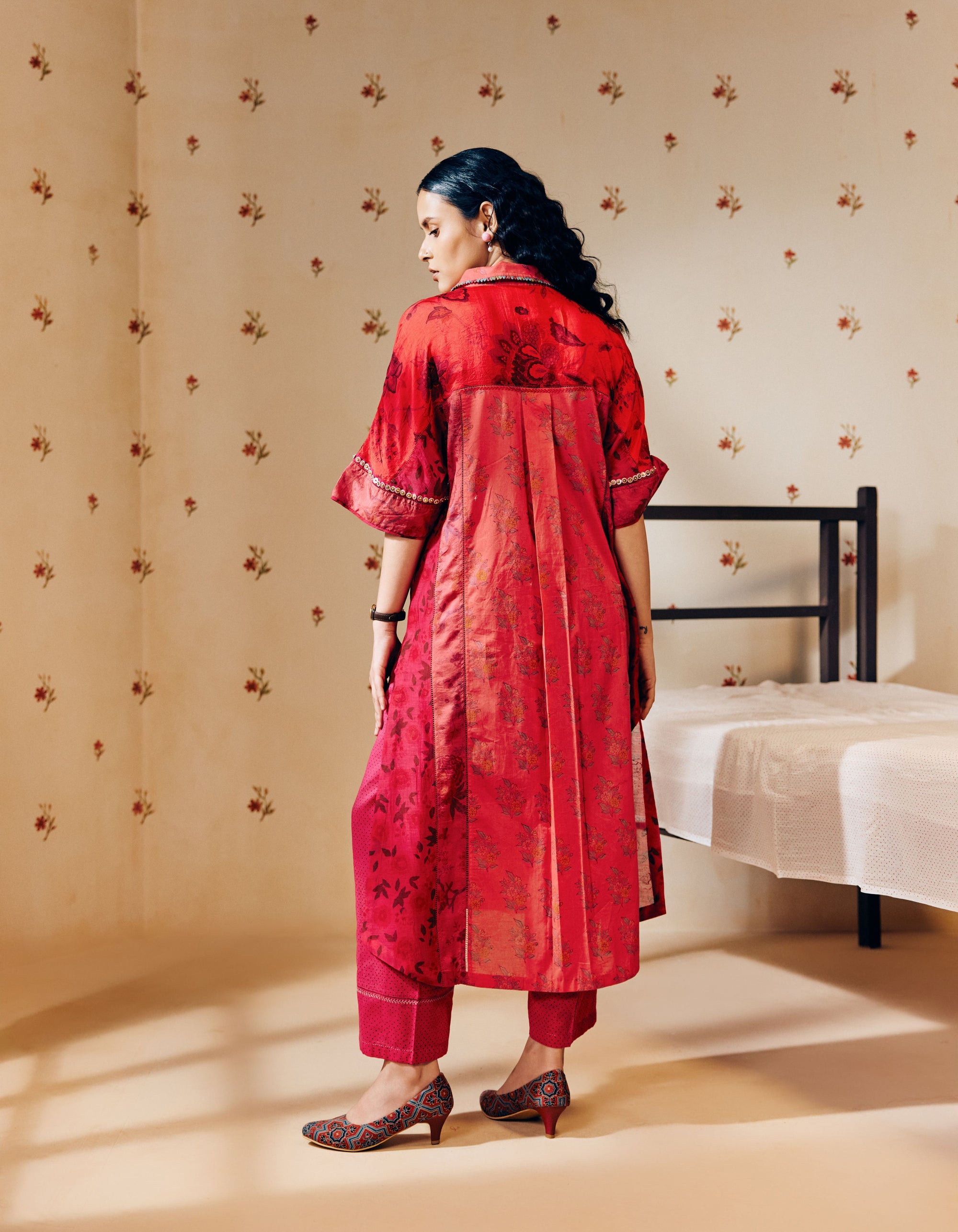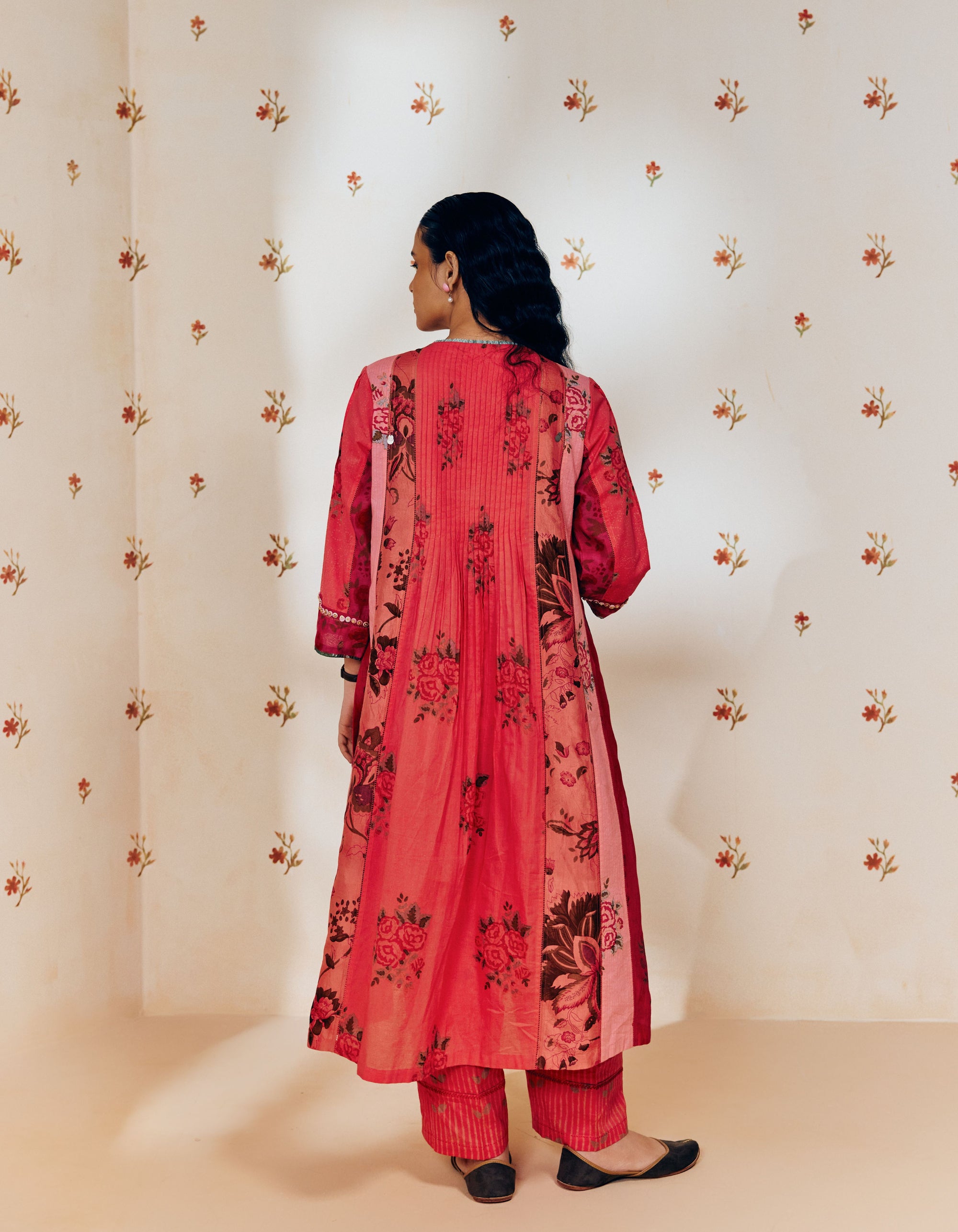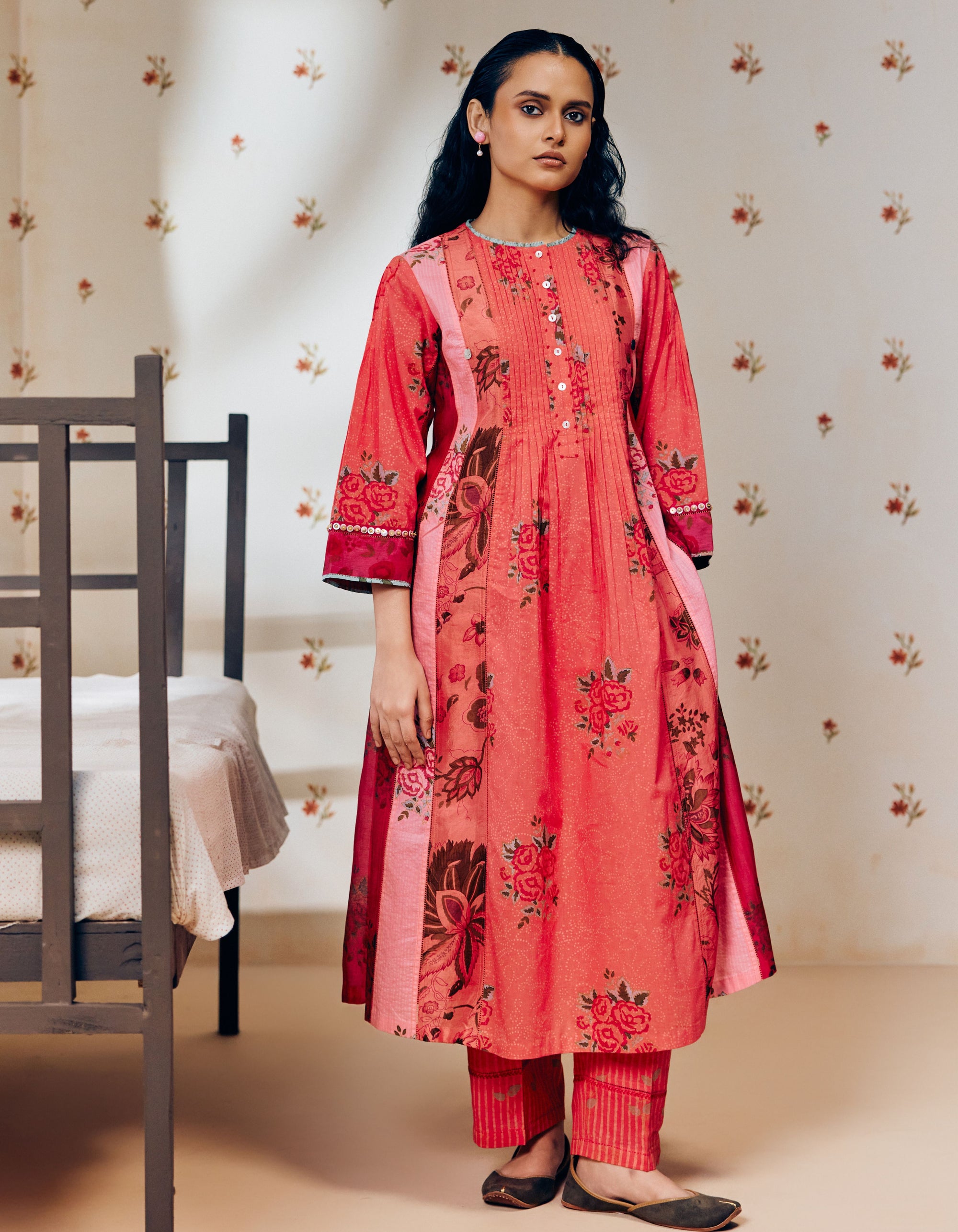 Rani Pink Pintuck Hand Block Printed Multi Panel Mia Kurta Set