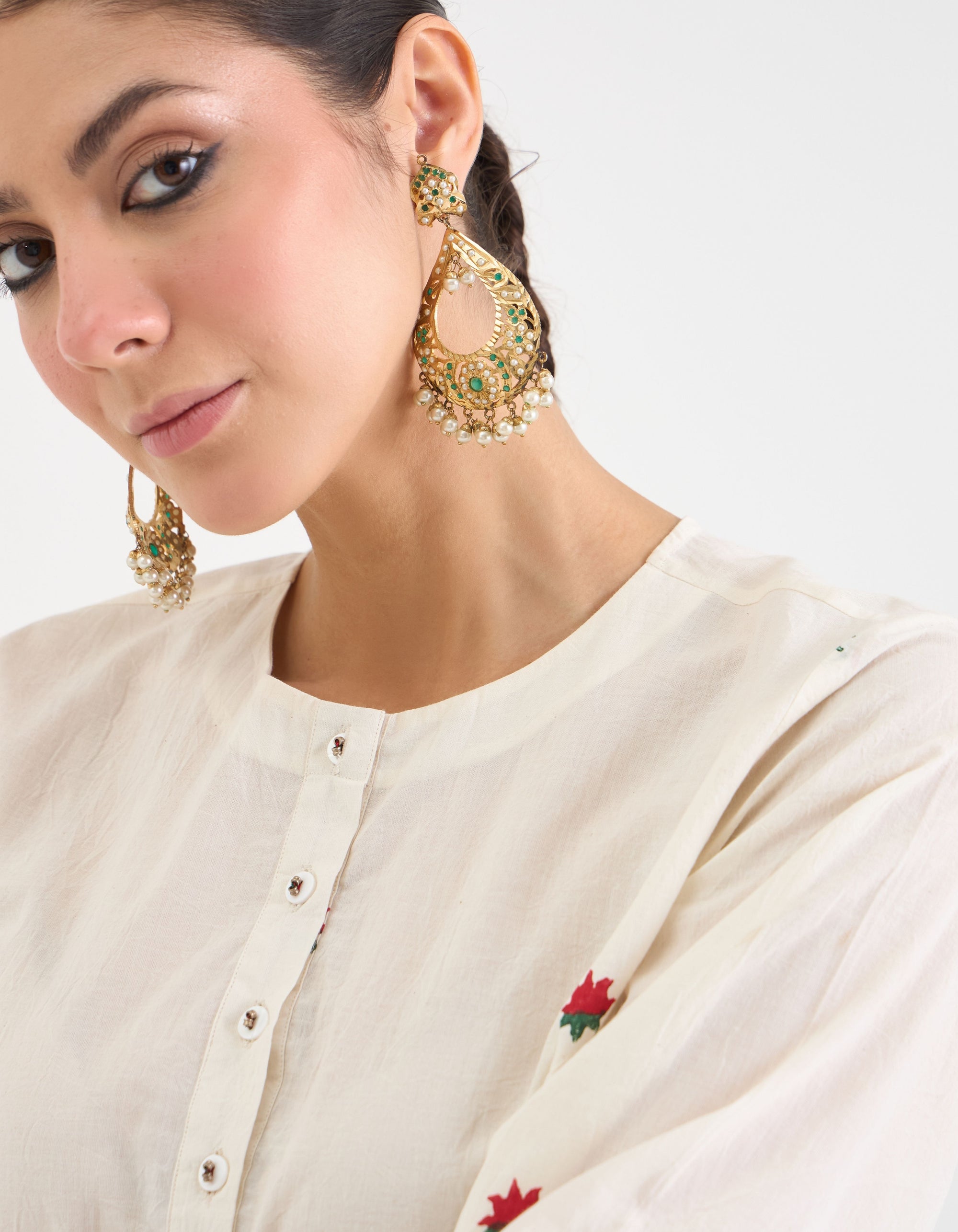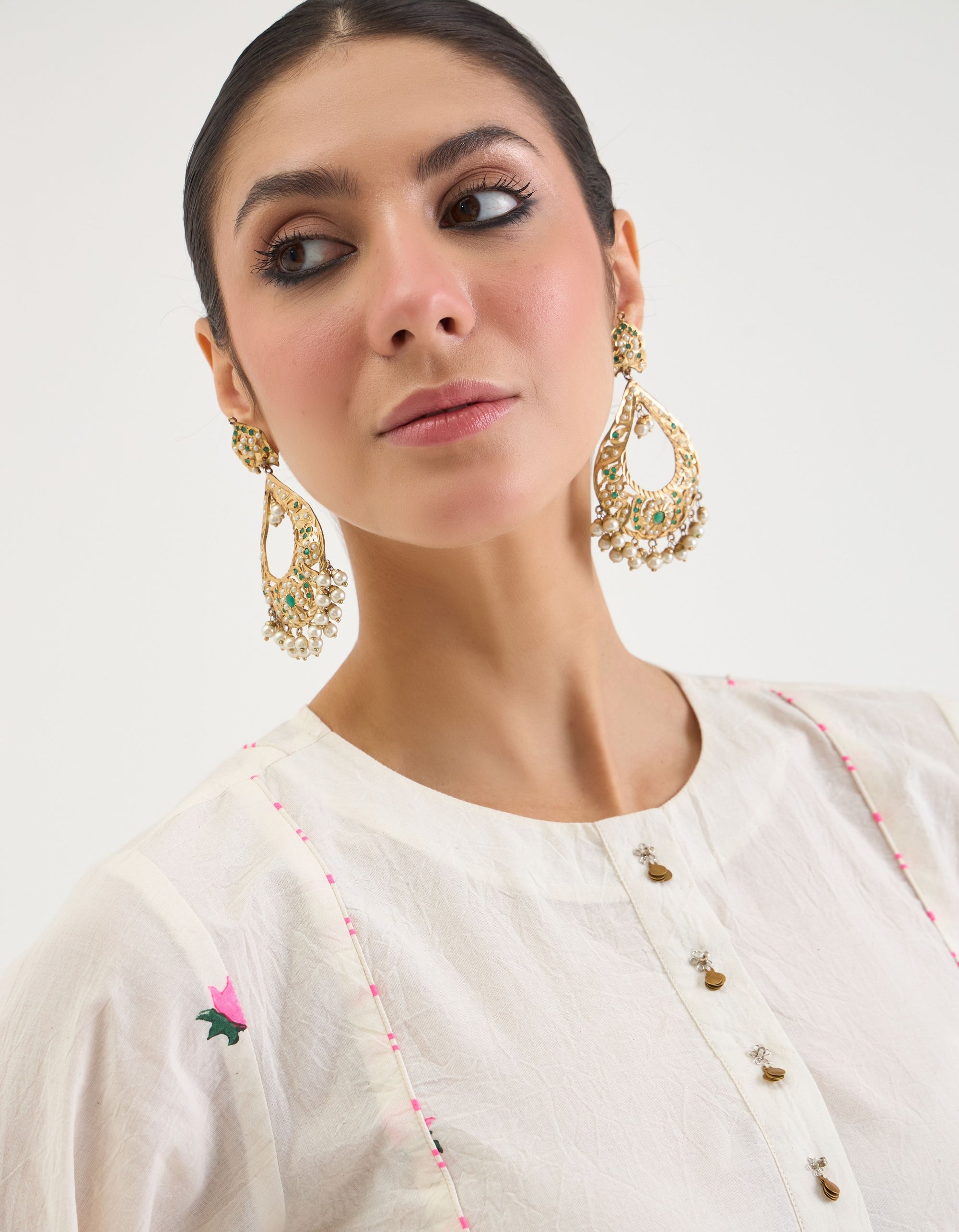 White Mughal Print Balloon Sleeve Mogra Kurta Set