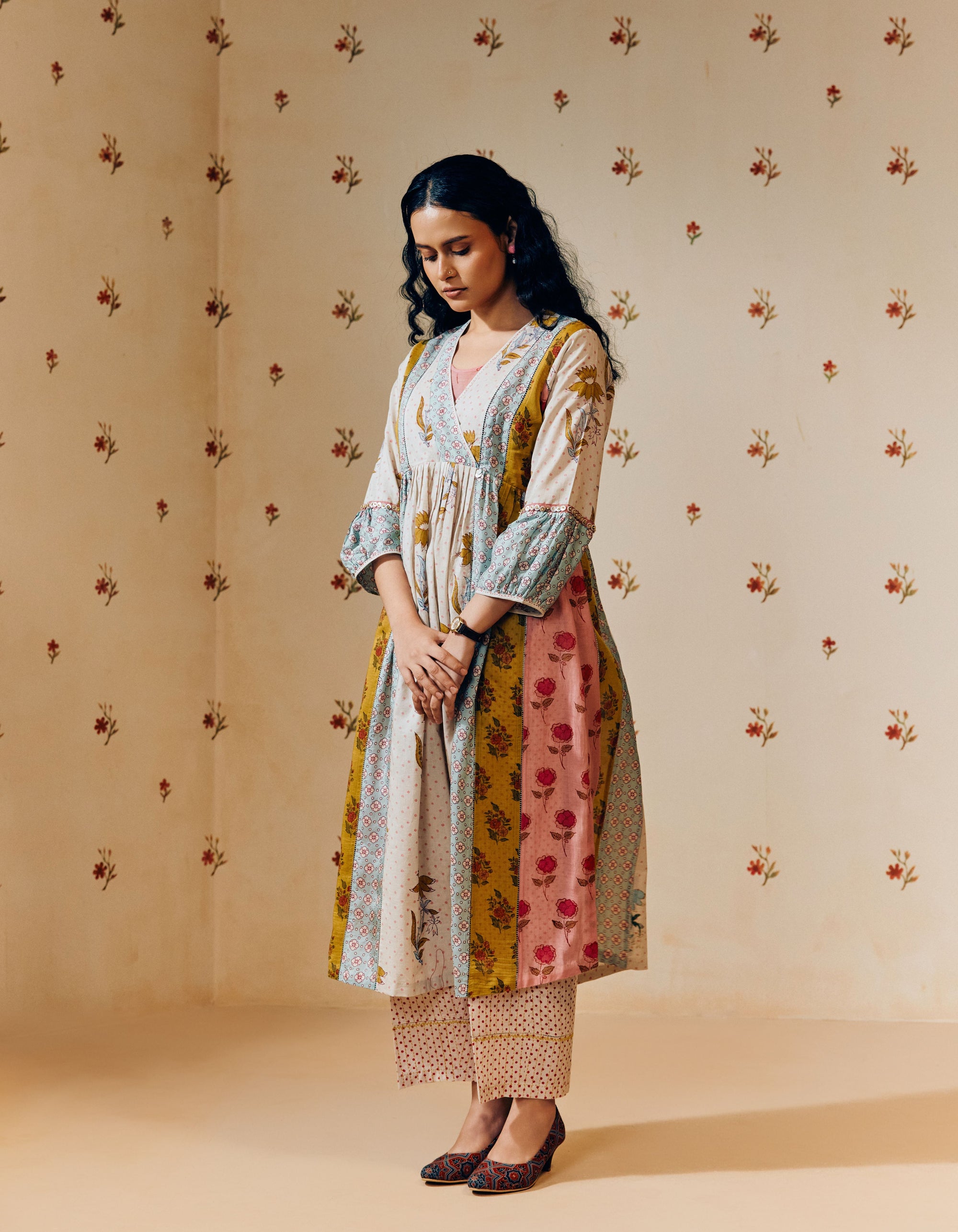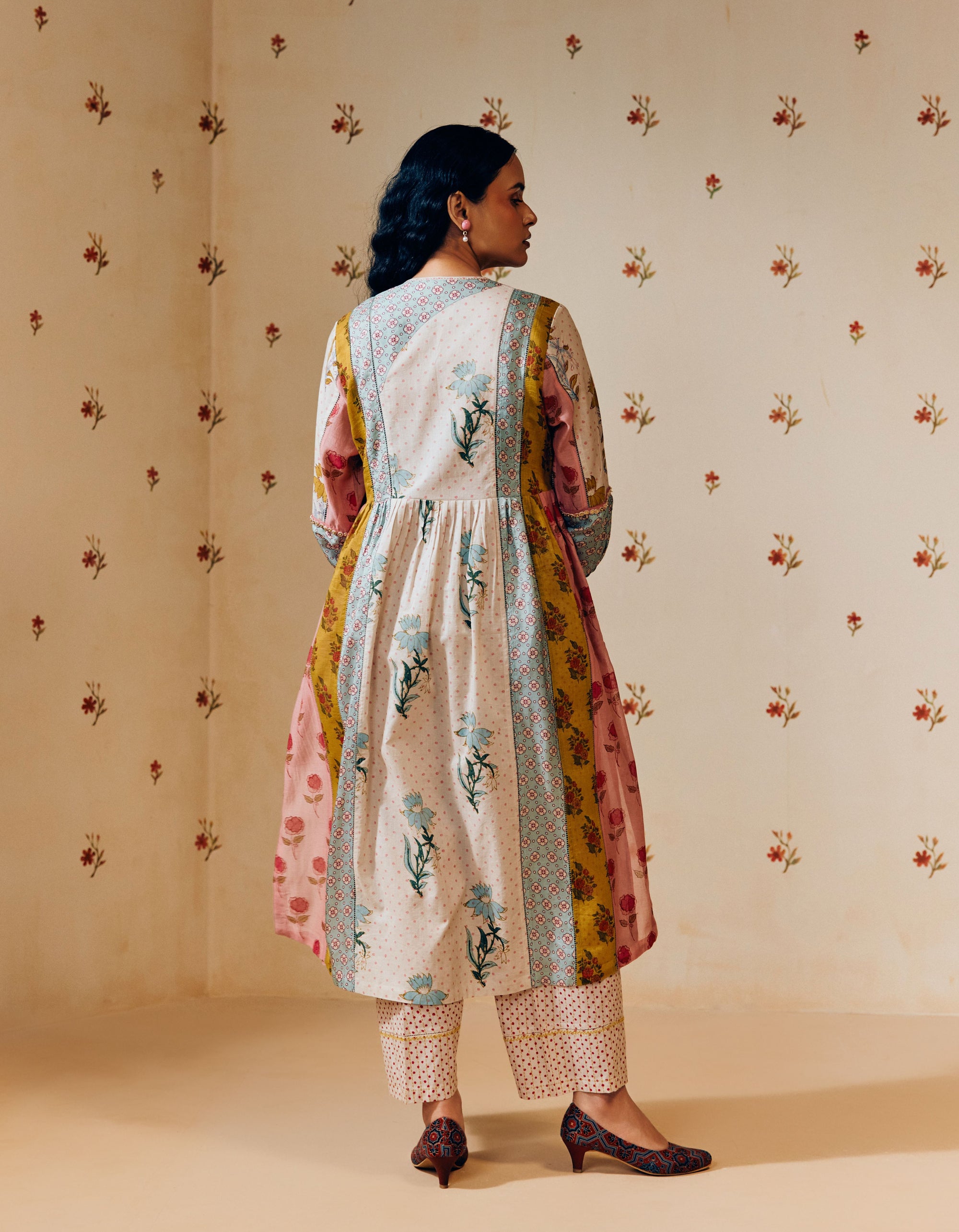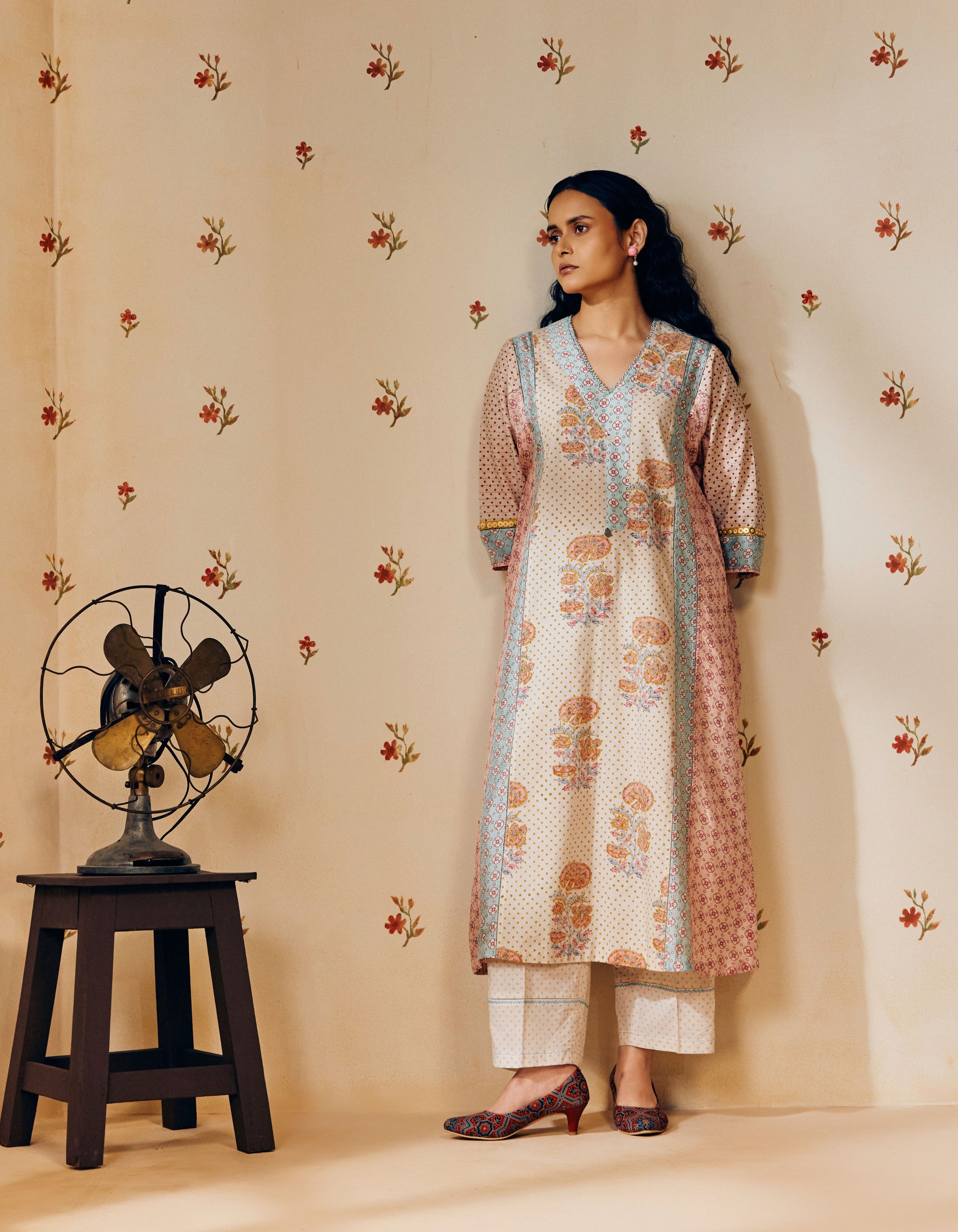 Off-White And Dusty Pink Front Gathers Hand Block Printed Multi Panel Mia Kurta Set