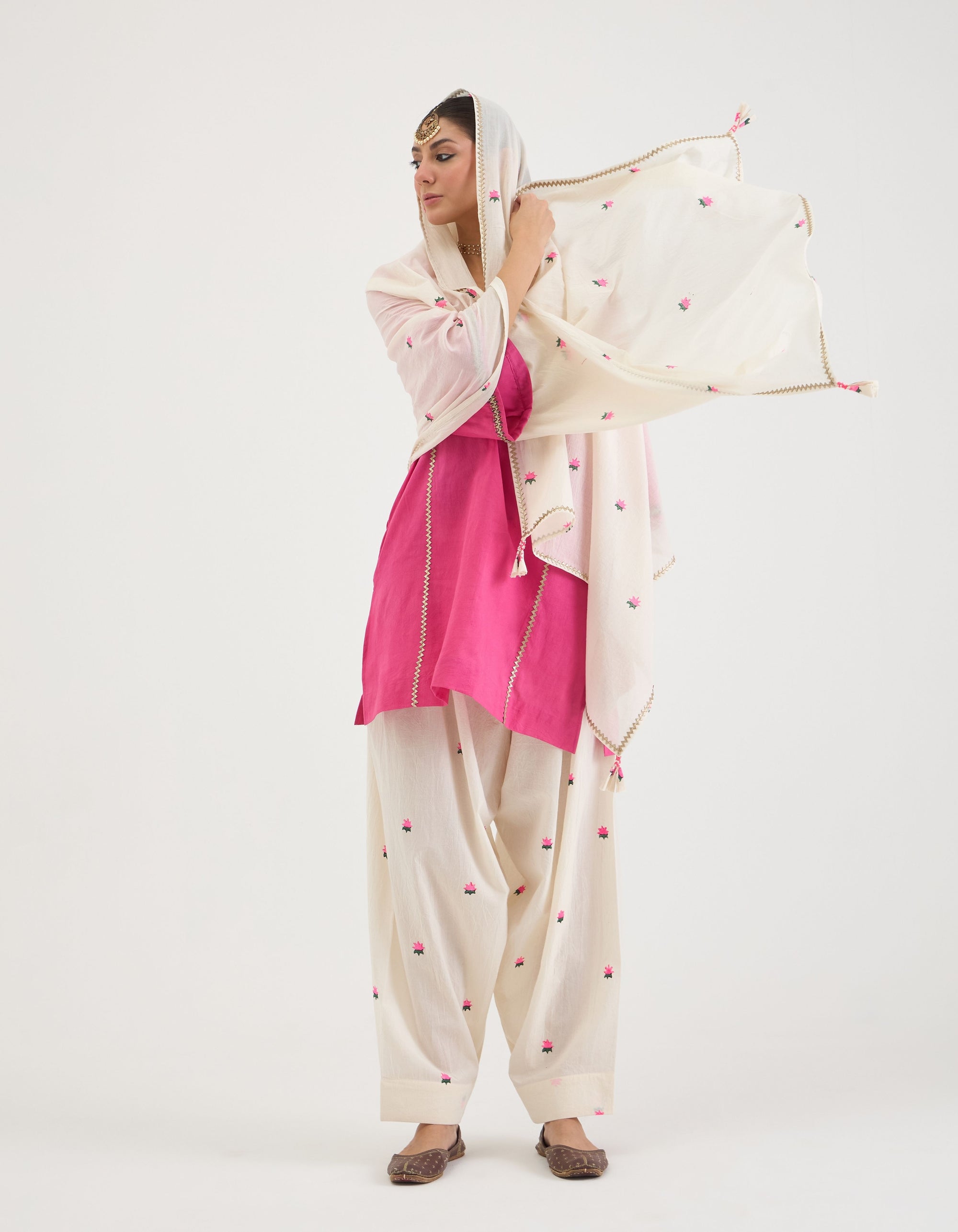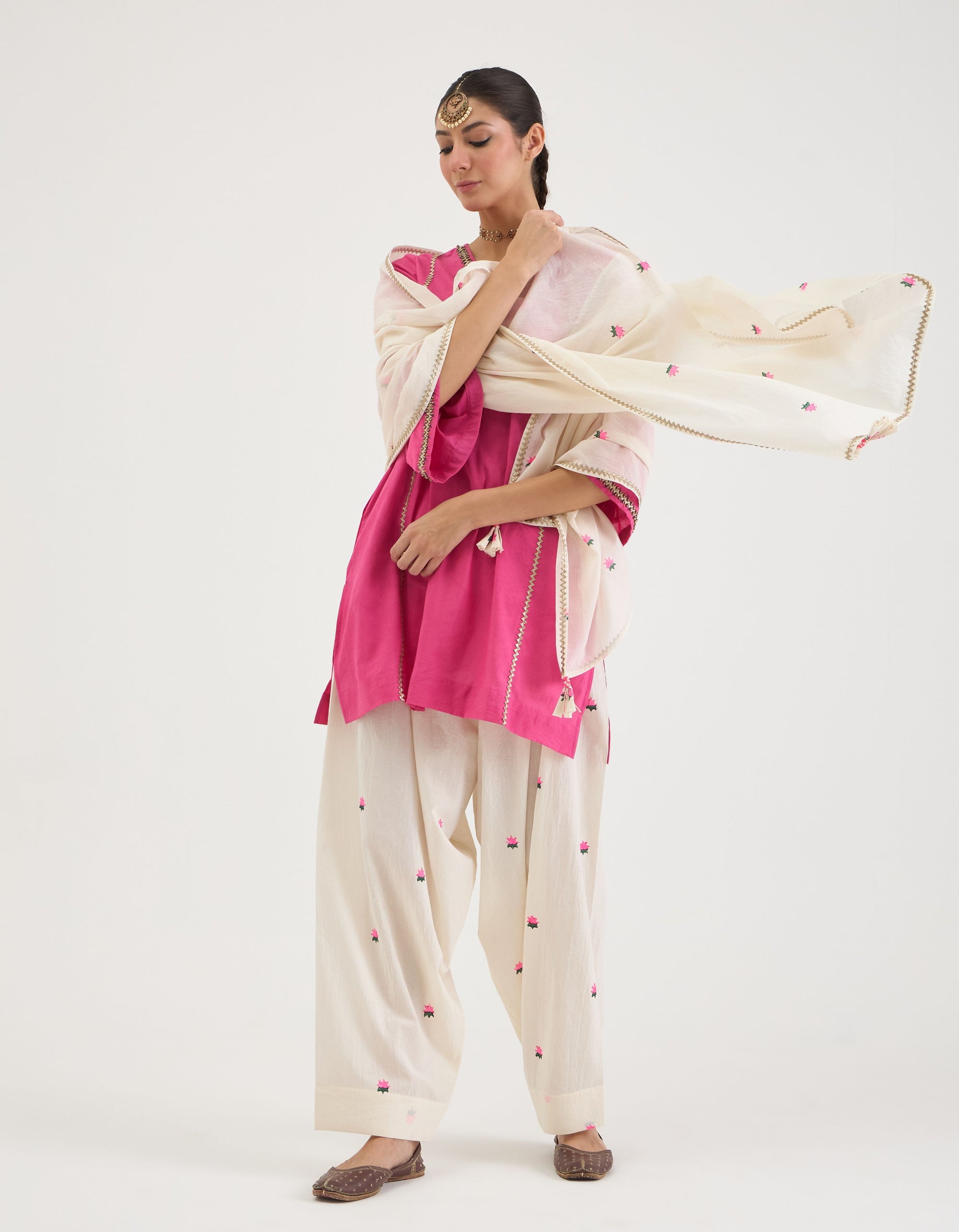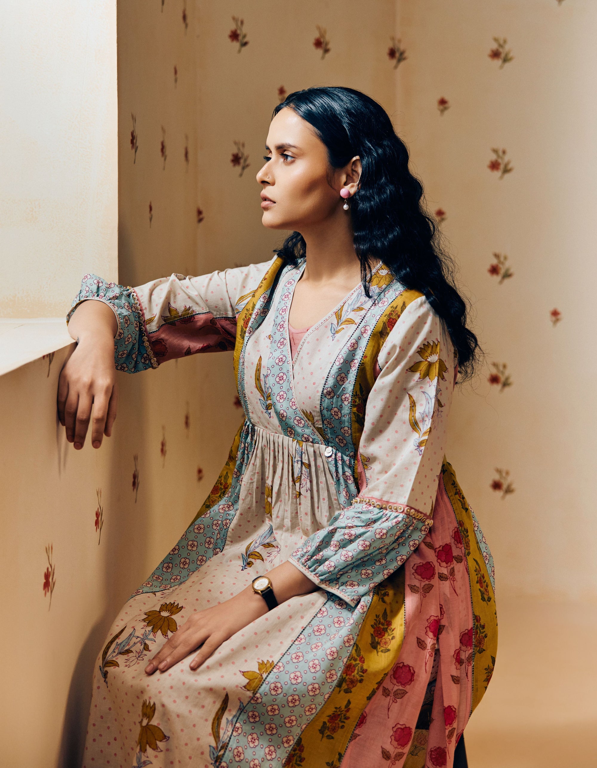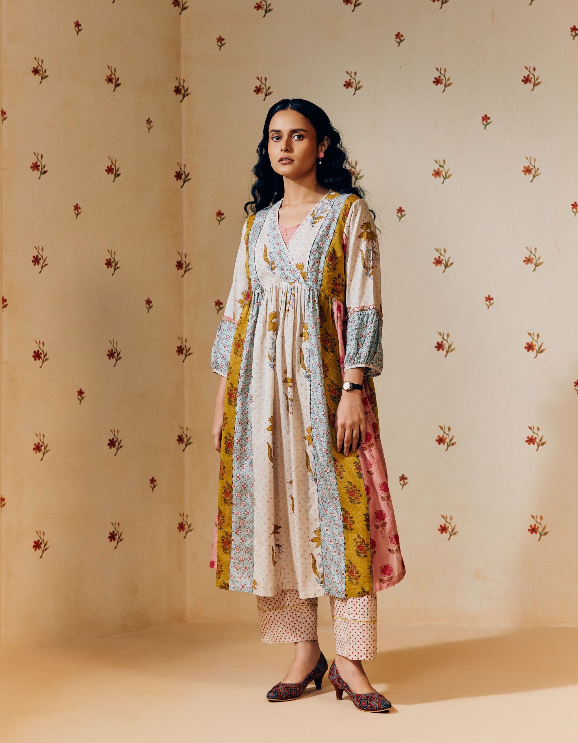 Off-White And Dusty Pink Front Gathers Hand Block Printed Multi Panel Mia Kurta Set