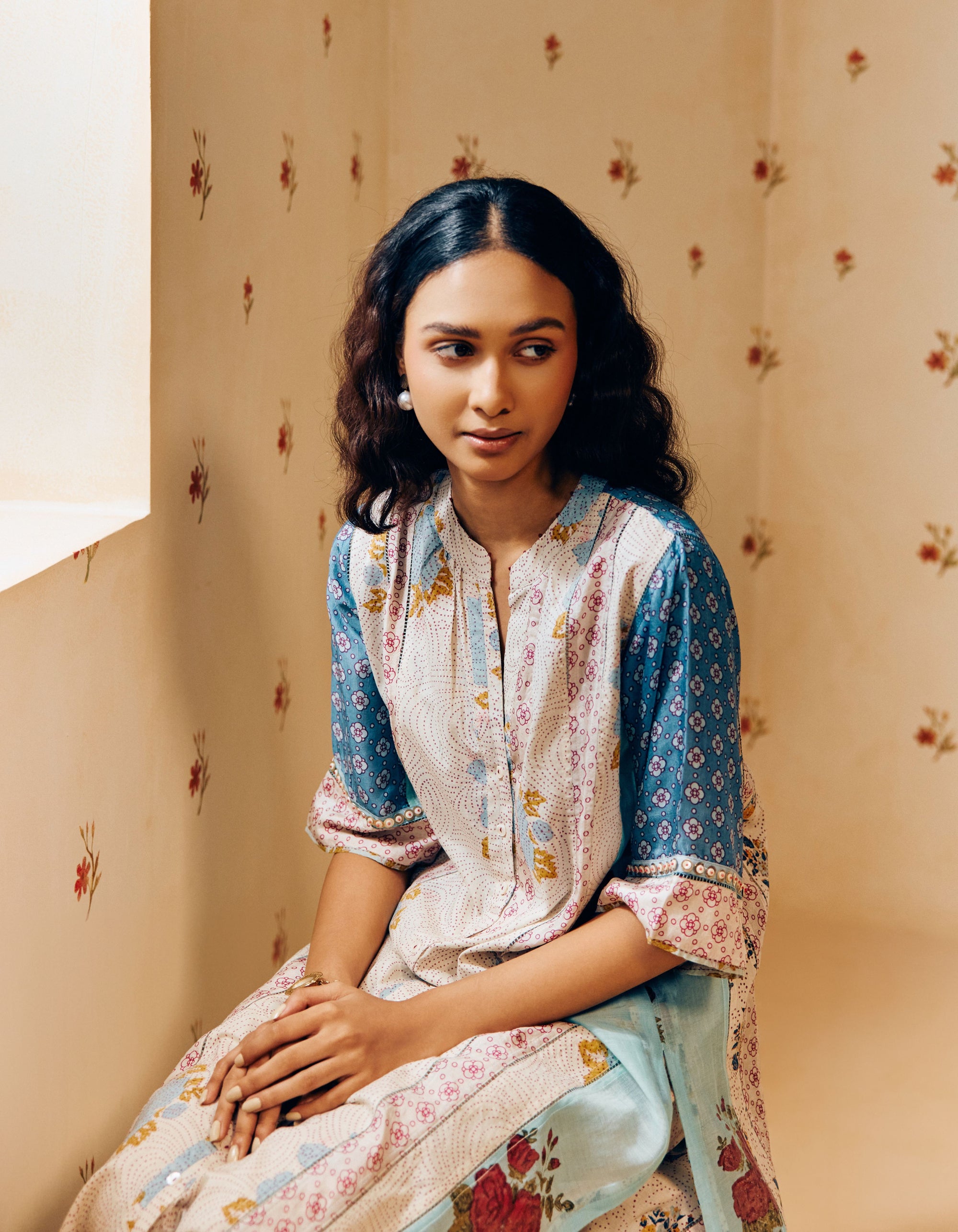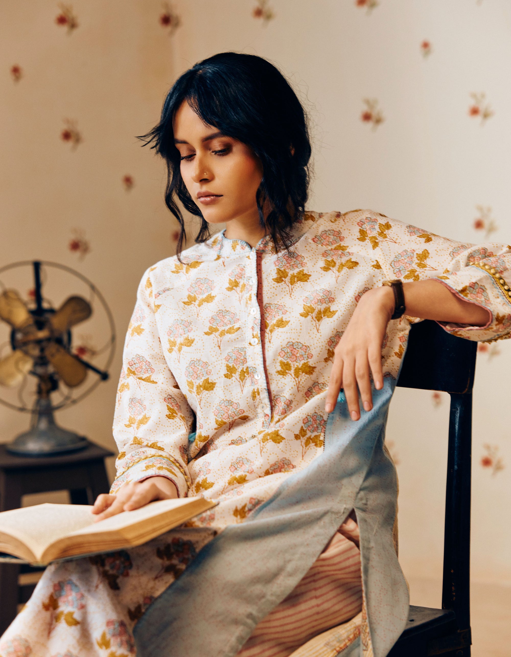 Off-White And Powder Blue Poppy Print Mia Kurta Set