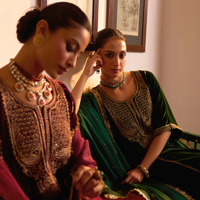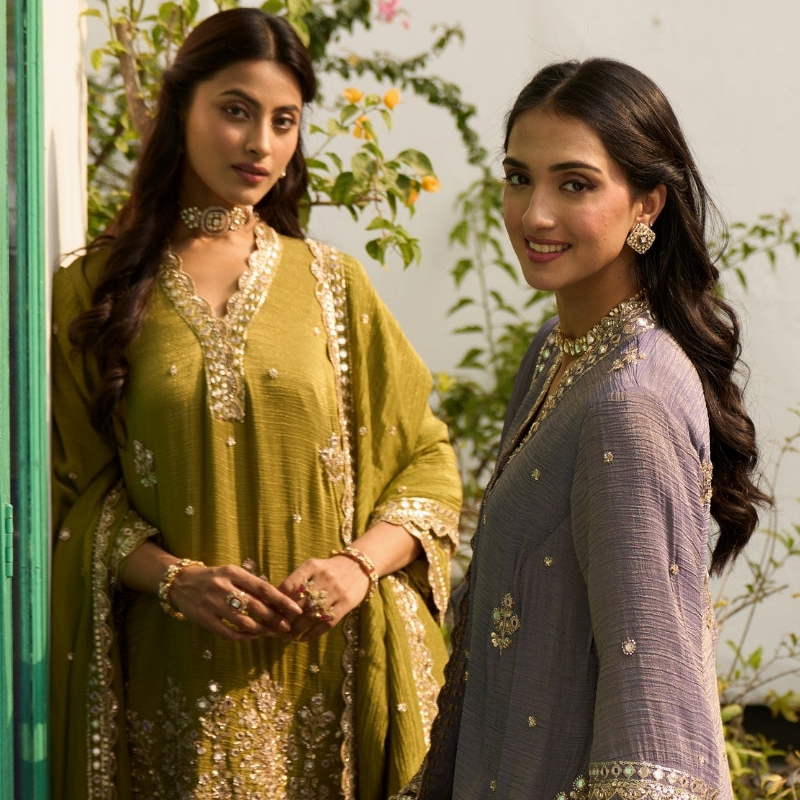 This 2 piece kurta set features classic Black kalidaar kurta crafted with delicate sucha gota work, blending classic cuts with modern refinement. The kurta features clean lines and thoughtful detailing, paired with our timeless gota salwar highlighted with artistic gota patterns.